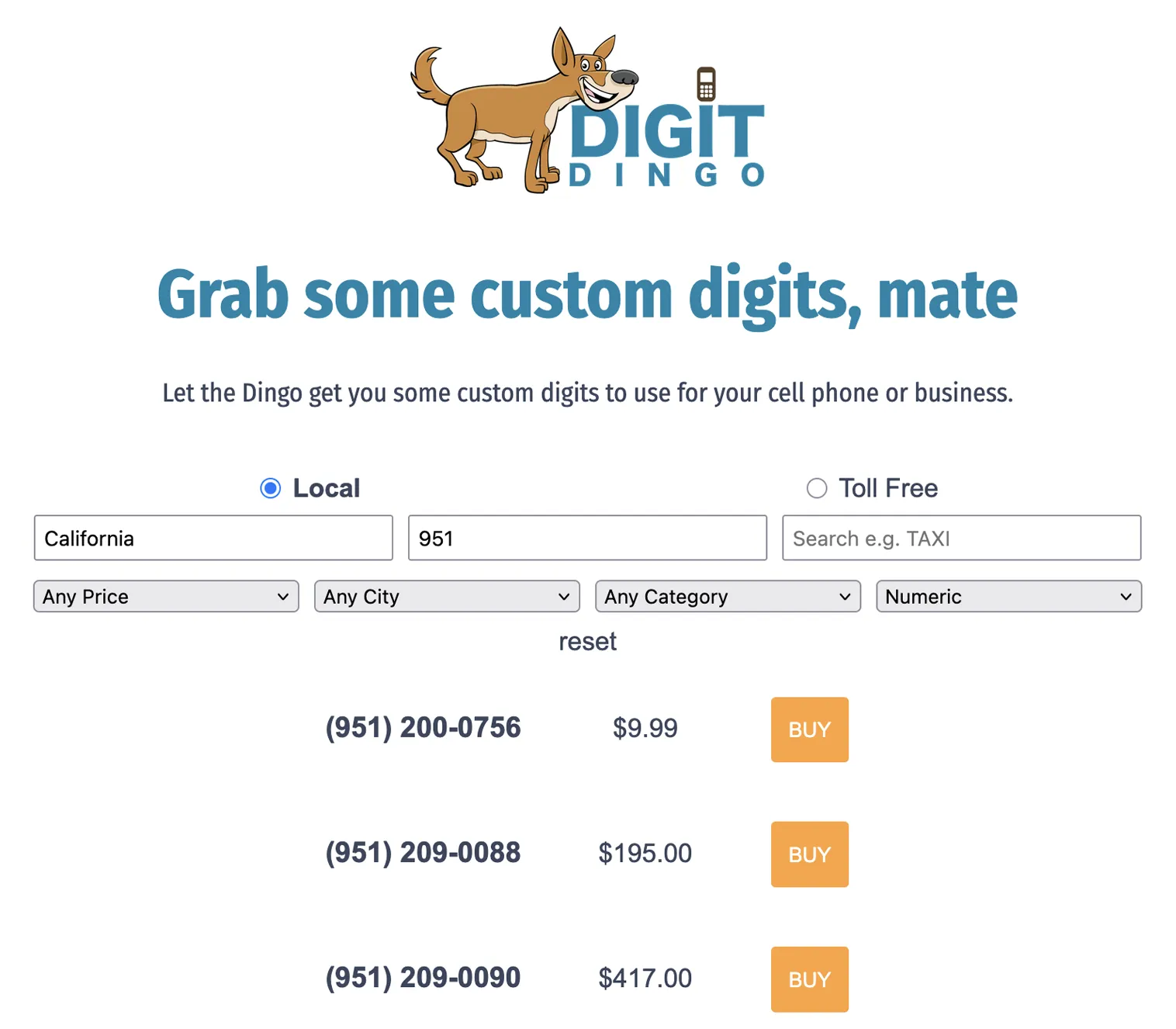Using NumberBarn's Embedded Search code, Digit Dingo allows visitors to search millions of available numbers, add to cart and checkout. Digit Dingo customers only see their branding and Digit Dingo maintains the customer experience.